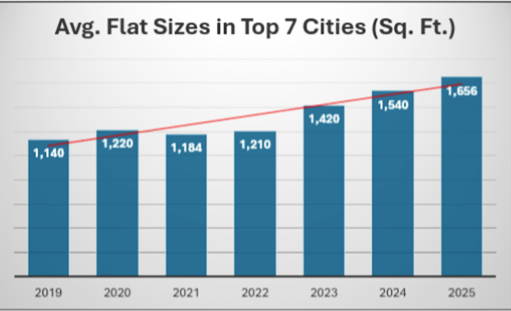 Across the top seven cities, average flat sizes have increased from 1,420 sq. ft. in 2023 to approximately 1,676 sq. ft. in 2025 — a 17% jump in two years. In 2024 alone, the average stood at 1,540 sq. ft., marking an 8% annual increase. The data indicates that developers are not merely responding to demand, but actively reshaping supply toward larger configurations.