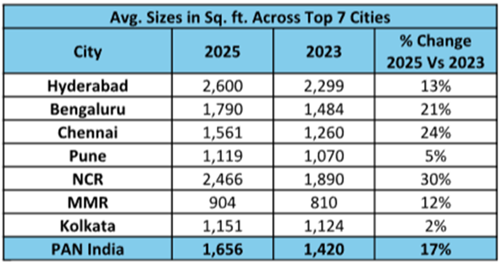 Hyderabad continues to lead in absolute size, with average flats touching nearly 2,600 sq. ft. in 2025, up from 2,299 sq. ft. in 2023. The city also saw the strongest one-year growth, with a 24% rise between 2024 and 2025.