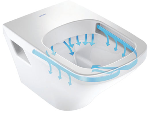 Duravit with its new rimless technology demonstrates how geometry, fluid mechanics and design can be successfully combined for maximum efficiency. In Duravit Rimless®, the open design of the WC rim enables an innovative and powerful flush; water flows in the form of a horizontal arc, and then vertically, before flushing the entire inner surface of the bowl without splashing.