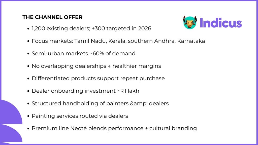 A key differentiator is Indicus’ no-overlap policy, which avoids appointing multiple dealerships within a short radius. This gives each partner a viable trading territory, improving business visibility and reducing internal friction — a frequent complaint in paints distribution.